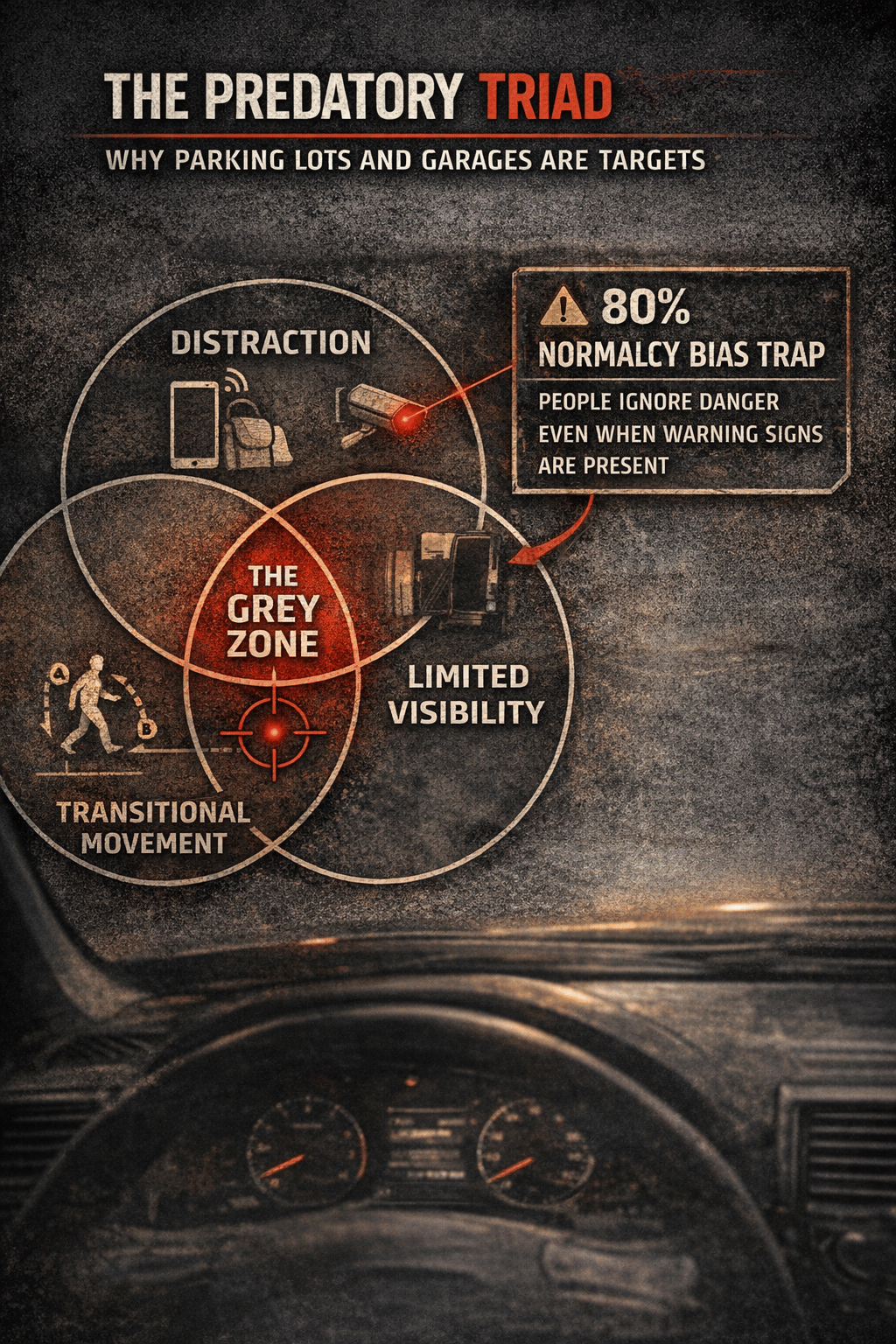 Parking lots and garages are ideal environments for opportunistic crime because they combine three conditions that predators look for—what we call the Predatory Triad: